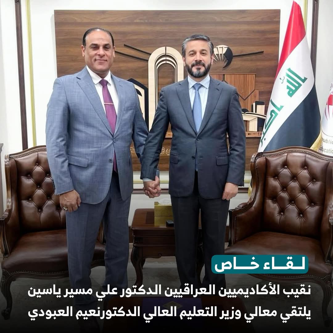 كما أكد الدكتور علي مسير ياسين أن الدعم المباشر والمستمر الذي يقدمه معالي الدكتور نعيم العبودي لنقابة الأكاديميين العراقيين يعكس التزامه الراسخ بحماية حقوق الأستاذ الجامعي، وتعزيز دوره في بناء المجتمع، مشيرًا إلى أن النقابة وجدت في شخص الوزير نصيرًا حقيقيًا للأكاديميين، ورافدًا داعمًا لمسيرتهم العلمية والمهنية.
